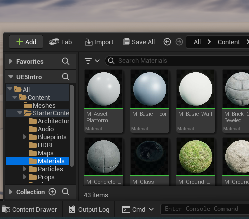 에디터 하단에 컨텐트 드로어(Content Drawer)를 열어서 아래처럼 머티리얼 리스트를 살펴 본다.