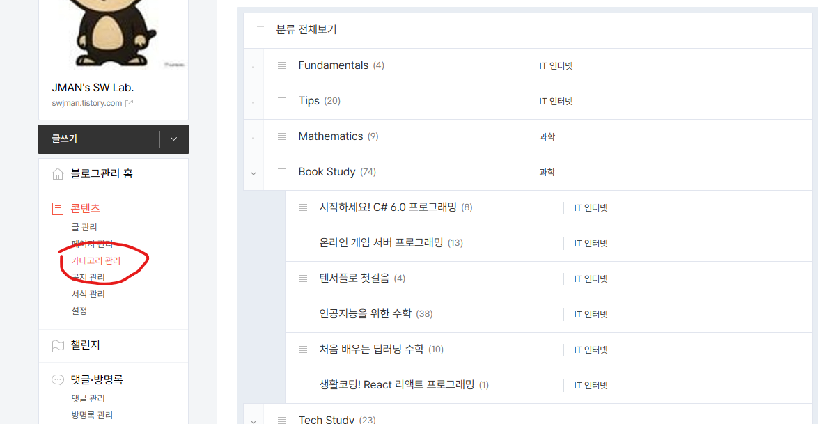 일단 티스토리 관리자 모드로 들어가고, 왼쪽 사이드바에 '콘텐츠 -> 카테고리 관리' 메뉴를 선택한다.