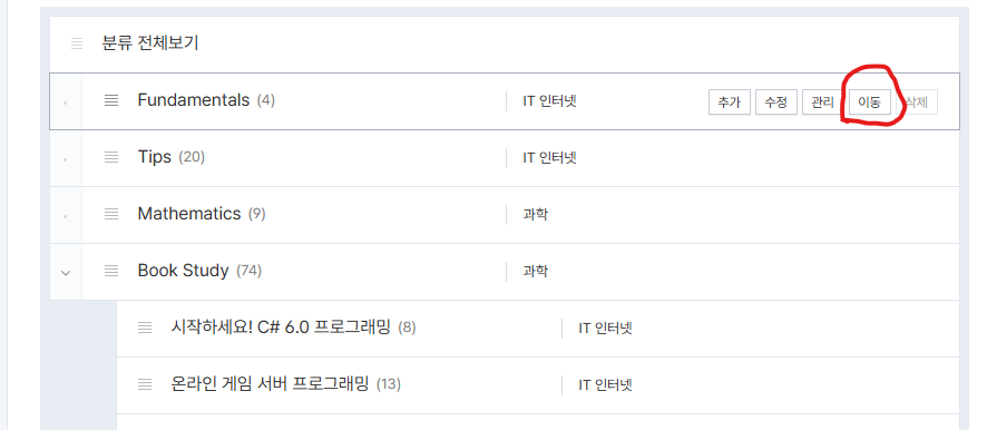 예상치 못한 상황에 당황했지만, 다행히 간단한 방법이 있다. 이동하고자 하는 카테고리에 마우스를 가져다 대면 버튼들이 보인다. 그 중에서 아래의 '이동' 버튼을 이용하면 된다.