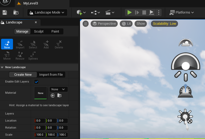 이번에는 랜드스케이프 다루는 법에 대해 배우게 되었다. 교재에선 배경이라고 큰 틀로 설명했지만, 지형에 특화된 기능으로 보인다. 이번 섹션에도 역시나 역시나 세세한 안내 덕분에 뇌없이 손만 따라가도 뭔가 만들어낼 수 있게 된다. 실습 중간중간 찍은 스크린샷으로 공부 내용을 갈음한다.