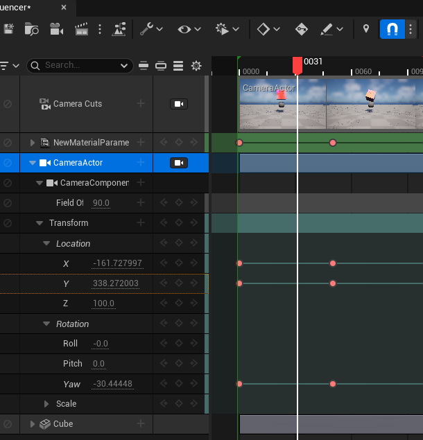이제 이 뷰를 영화처럼 카메라 워크를 할 수 있도록 시퀀서에서 편집이 가능하다. 아래처럼 월드에 추가했던 카메라 액터를 시퀀서에도 추가해주고 편집하면 된다.
